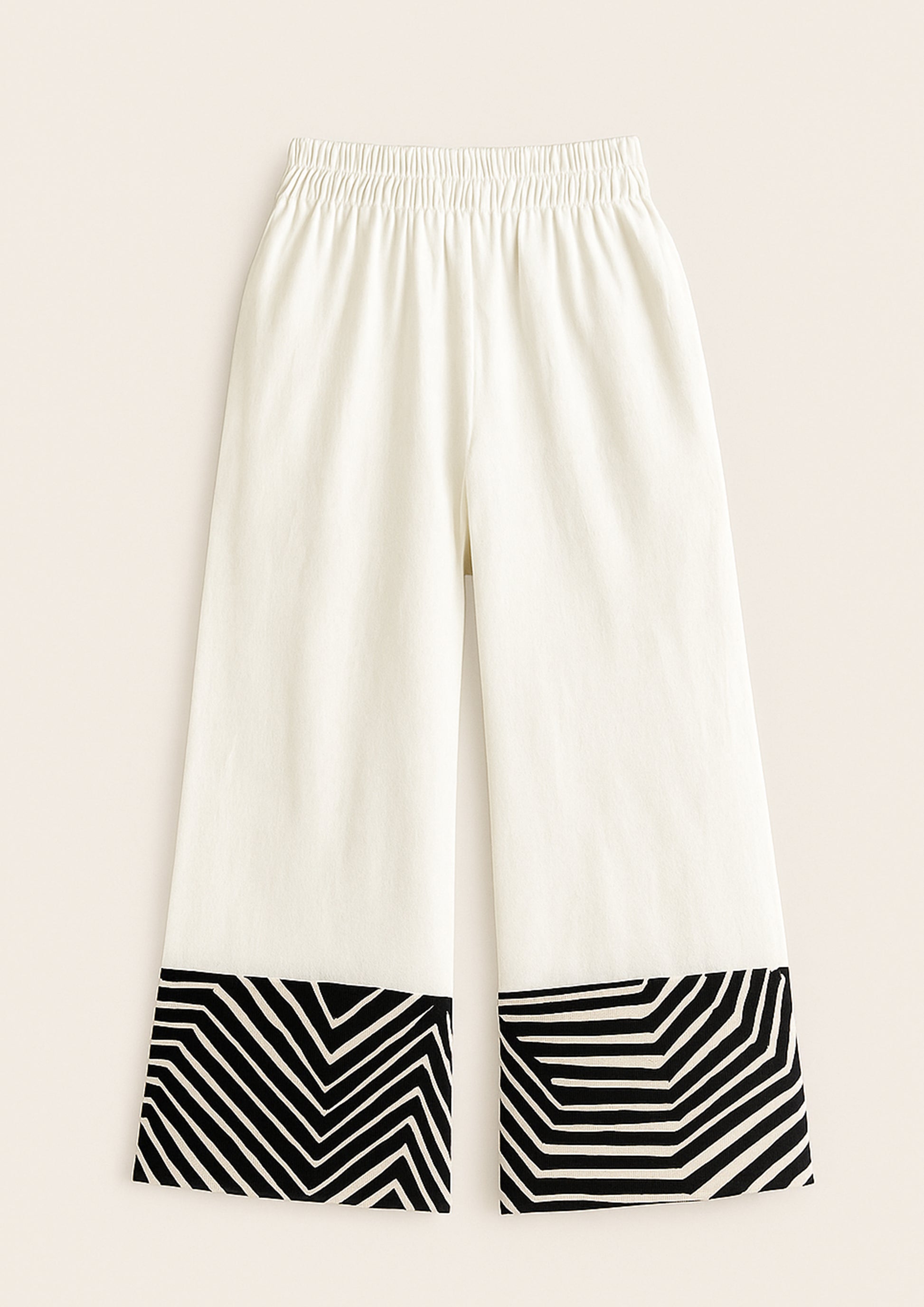 The Zig Trousers feature a straight leg and contrast zigzag panel at the hem — adding a bold, sculptural finish to a timeless silhouette. Pair with the Zig Kimono or wear solo for subtle drama.